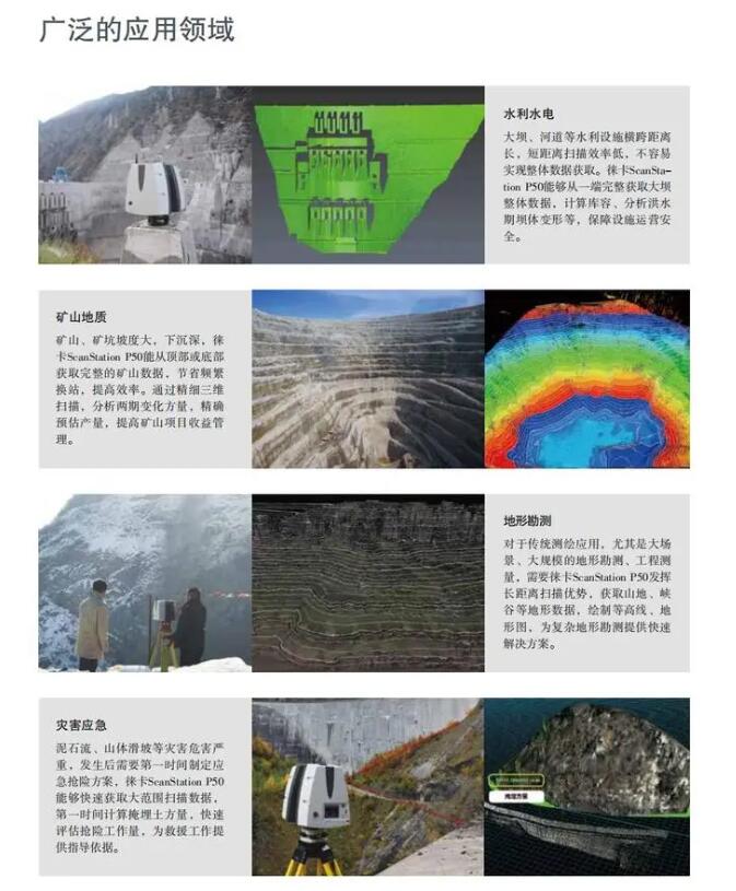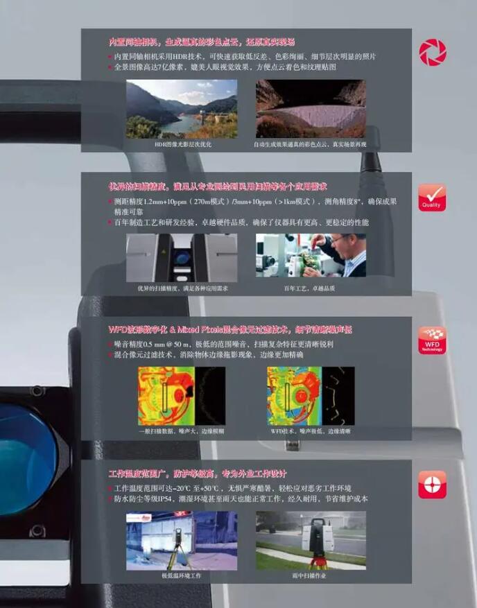 徠卡測量系統打造的長測程三維激光掃描儀ScanStation P50,在繼承高精度的測角測距技術、 WFD波形數字化技術、 Mixed Pixels混合像 元技術和HDR圖像技術的同時,掃描距離提高至1km以上,使得徠卡ScanStation P50具有更長的測程和更強大的性能,滿足長距離及各種掃描任務需求。